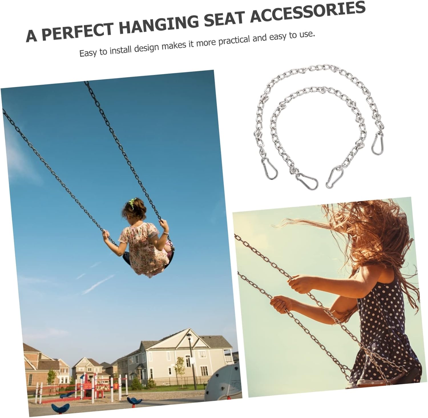 Package List 2 x Chain Accessories Features - Size: About 77.00X3.00X2.00cm; 30.26X1.18X0.79in swing chair chain - Color: Silver swing chair accessories - Suitable for most kinds of swings: tree swings, tire swings hammock, etc Hammock Extension Strap. - Material: 304 stainless steel, iron Extension Hanging Kit - 304 stainless steel and iron, strong and durable, good toughness, bearing capacity Hammock Chair Hanging Kit. - Adopted of environmental protection material, they are strong and durable hammock swing chain. - You can adjust the fit height you want to fit your swings or hammocks Swing Hanging Straps. - Help you tightly fix your string and ensure your safety Useful Chains.Goods DescriptionIron Swing Rope It's easy to install and bring you and your family relaxing time.Swing Hanging Straps It is strong and durable, which can be well-fitted to your rope chair, swing, swing, , etc.Hammock Accessories This item is made of .swing chair accessories Get your family outdoors and enjoy quality time on the backyard swing